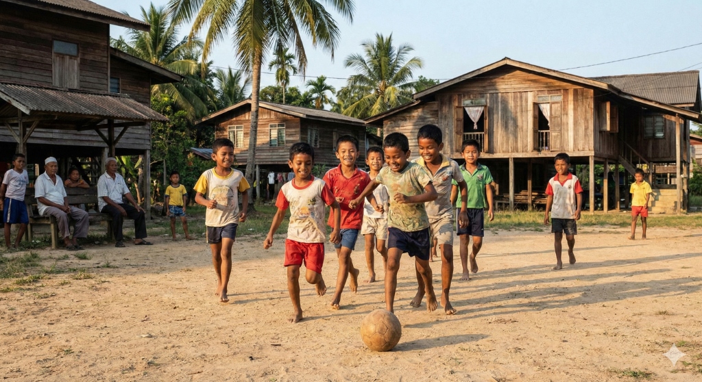 In the kampung (village), the field isn't manicured grass. It's riverbanks, muddy paddy fields, and dusty clearings. The goalposts are bamboo sticks, and the boundaries are where the jungle begins.